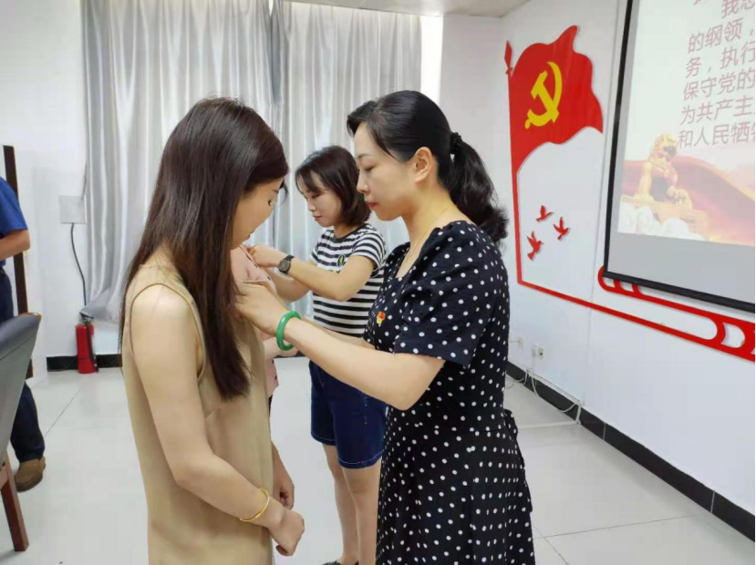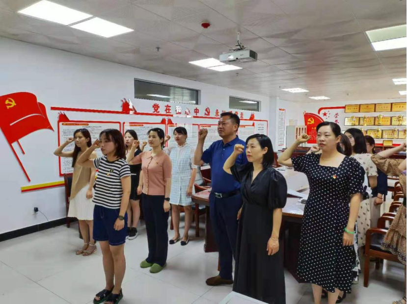 在教工党支部宣传委员李桂林同志的带领下,张颖颖、刘铮两位同志及yl88858永利中国全体教工支部党员面对党旗,庄严宣誓。