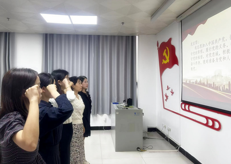 在教工党支部宣传委员李桂林同志的带领下,张颖颖、刘铮及其他党员同志面对党旗,庄严宣誓,两位同志表示在今后的工作中将继续向老党员学习,为党的教育事业贡献力量。