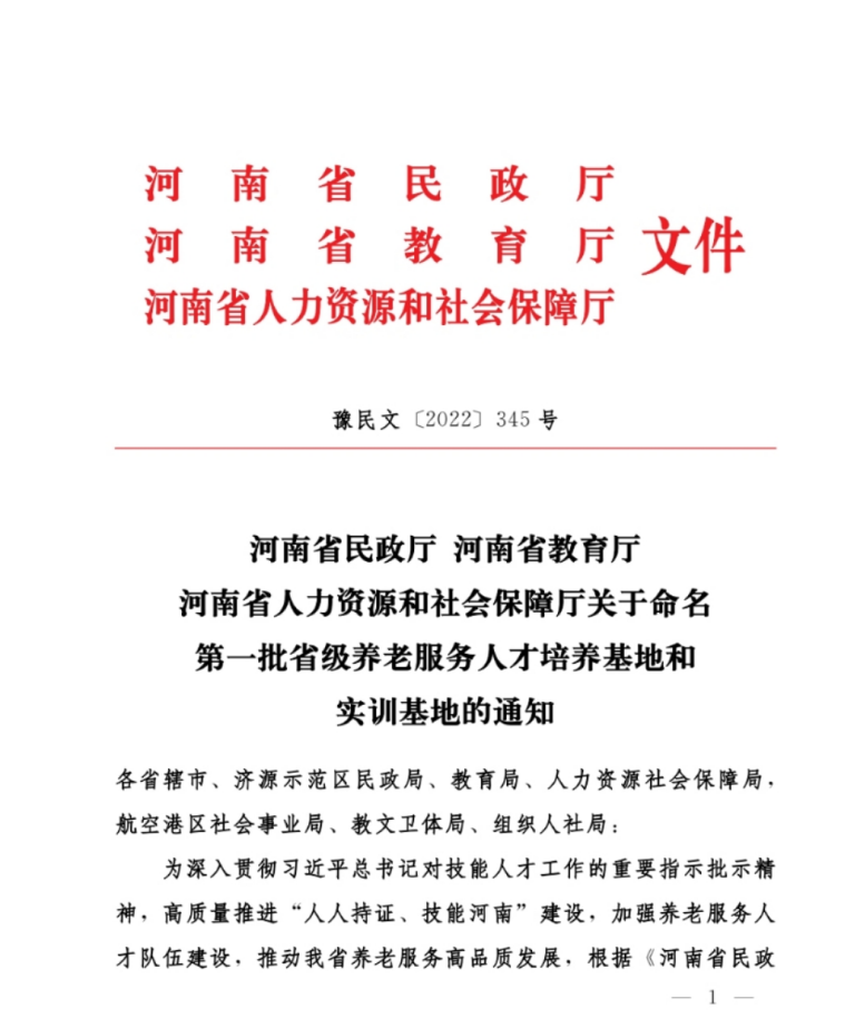 日前,河南省民政厅、河南省教育厅、河南省人力资源和社会保障厅联合发文,命名第一批省级养老服务人才培养基地和实训基地,yl88858永利中国获批省级首批21家养老服务人才培养基地之一。