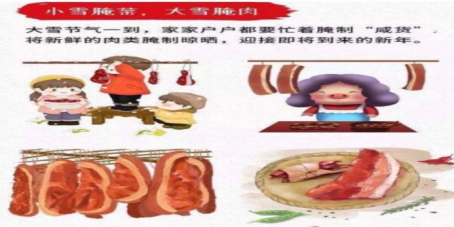 有句俗语:“小雪腌菜,大雪腌肉”。大雪节气一到,家家户户忙着腌制“咸货”,挂在朝阳的屋檐下晾晒干,以迎接新年。大雪节气适合温补,素有“冬天进补,开春打虎”的说法。另外,大雪过后人们就可以开始一些雪中趣事,如滑冰、听雪敲竹、踏雪寻梅、煮雪烹茶等活动。