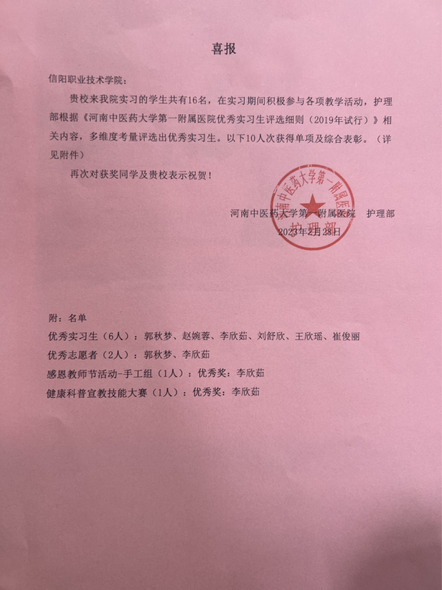 2月28日,从河南中医药大学第一附属医院传来佳讯,医院护理部根据《河南中医药大学第一附属医院优秀实习生评选细则(2019年试行)》相关内容,多维度考量评选,我校16名实习生中有10人次获得单项及综合表彰。