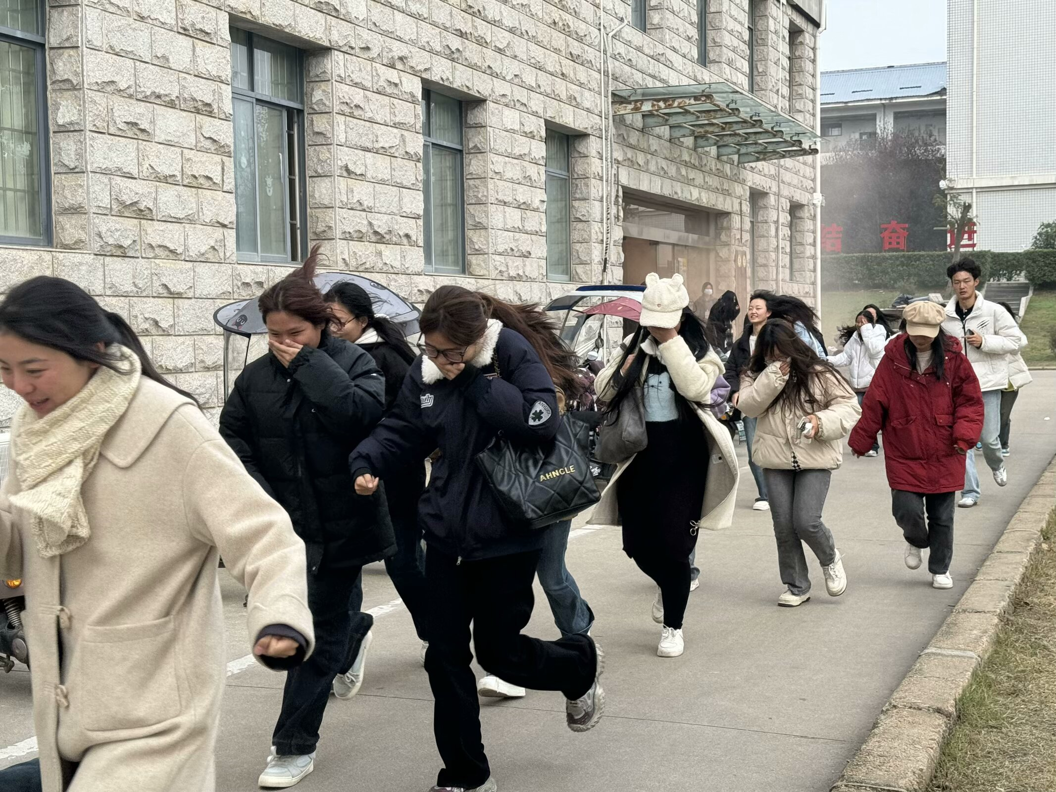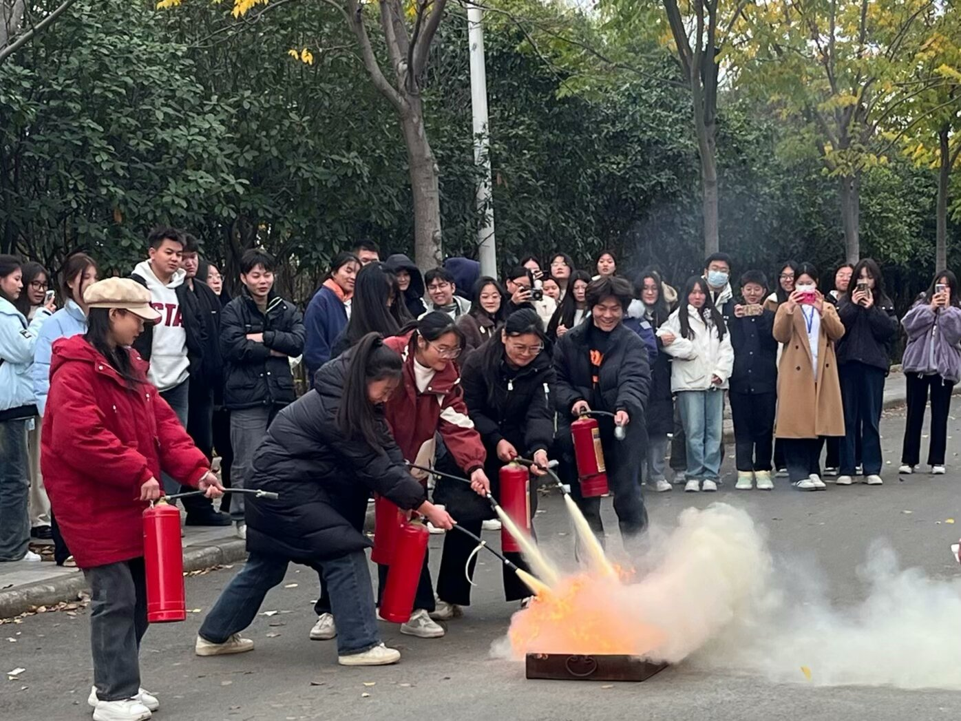 随着一声尖锐的警报声响起,消防演习正式拉开帷幕。同学们反应迅速,按照预定的疏散路线,捂住口鼻,弯腰低头有序地向安全区域撤离。在疏散过程中,大家听从指挥,相互照应,确保每一位同学都能安全到达指定地点。最后,吴科长现场给同学们讲解了灭火器的正确使用方法,同学们纷纷上前演练,在实践中掌握了灭火技能。