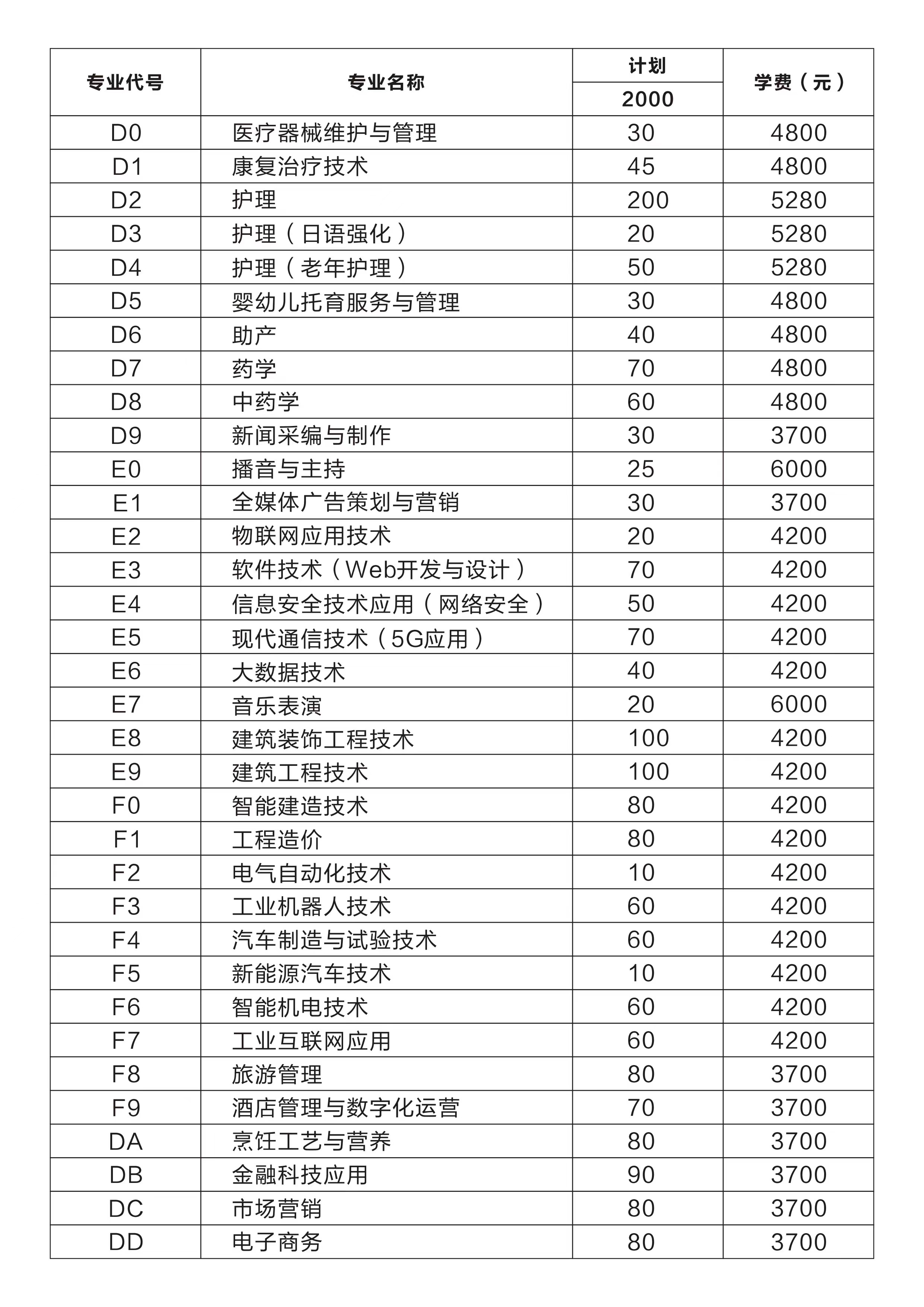2024年单独招生计划及专业代码(学校招生代码:6288)