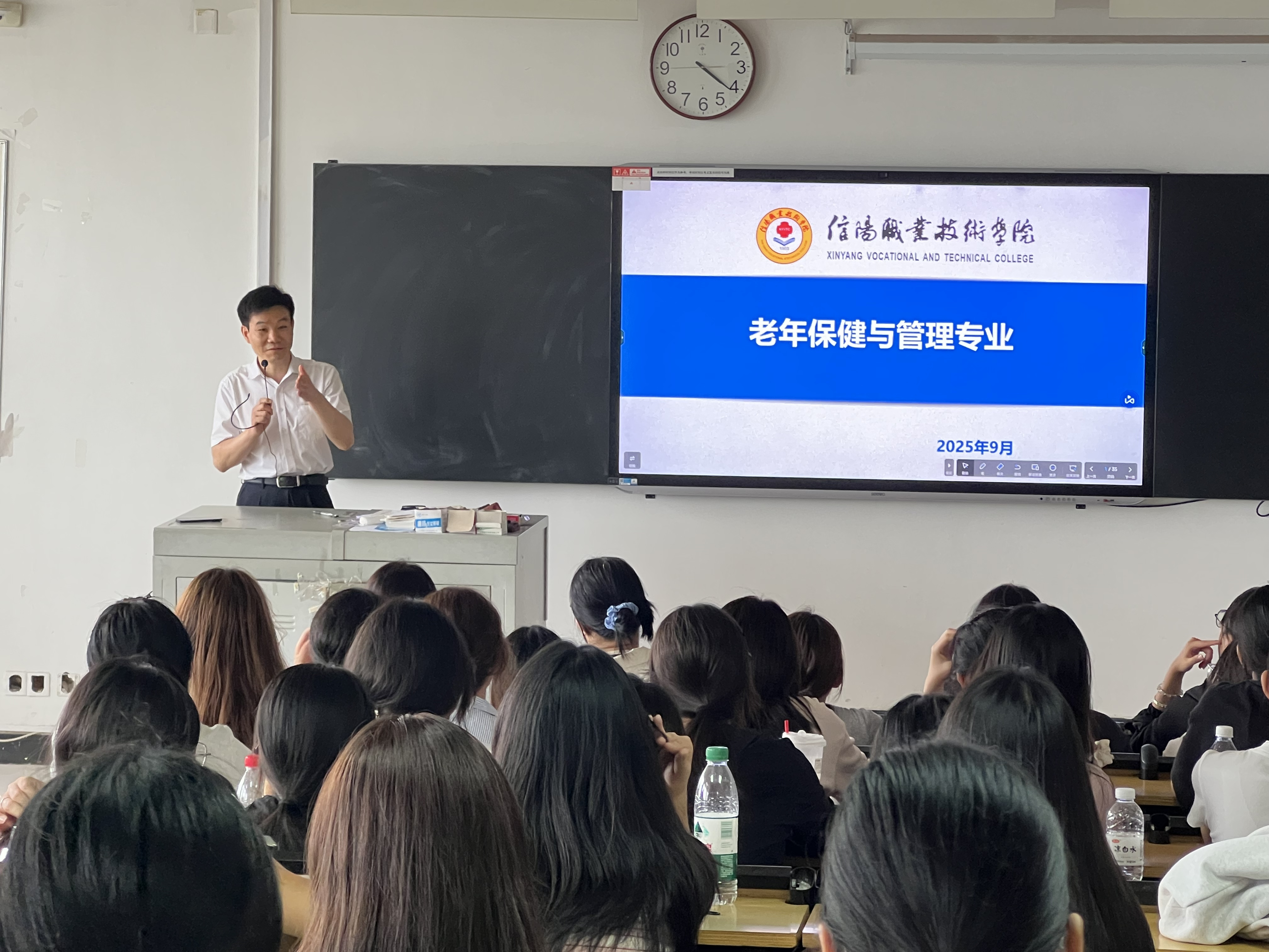 本次活动以“强化专业认知、树立职业信念”为主题,旨在帮助新生深入了解行业前景、明确学习目标、增强专业认同感。贾经理结合当前国家健康政策与行业发展趋势,详细介绍了康养产业的发展现状与未来方向,河南圣德健康养护中心的发展理念、运营机制、岗位设置及薪资待遇,同时强调了老年保健与管理专业在应对人口老龄化、推动健康中国建设中的重要作用。他鼓励同学们坚定理想信念,扎实学习专业知识,注重道德修养,努力成为兼具专业技能与社会责任感的高素质康养人才。活动中,他与学生进行了亲切交流,耐心地解答了同学们关于专业学习、实习实践及职业发展等方面的疑问,现场气氛热烈。